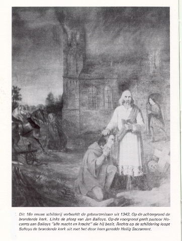 astoor Hocaerts, die door de steeds meer om zich heen grijpende vlammen bang geworden was zelf het brandende gebouw binnen te gaan, heeft toen tegen de boer gezegd: ''Voor dit geval geef ik jou al mijn macht en kracht die ik bezit''. Na die woorden gehoord te hebben, liep Jan Baloys naar de kerkdeur om door de brand heen het Heilig Sacrament er uit te halen. Inmiddels waren er veel mensen naar de brandende kerk komen kijken. De pastoor en alle omstanders zagen hoe het vuur zich splitste en plaats maakte voor de boer. Ongedeerd trad Jan Baloys uit de vlammen tevoorschijn. Hij had zich niet verbrand, was niet gewond en zijn kleren hadden geen schade geleden. Aan de pastoor overhandigde hij het ciborie met daarin het Heilig Sacrament dat hij gered had.